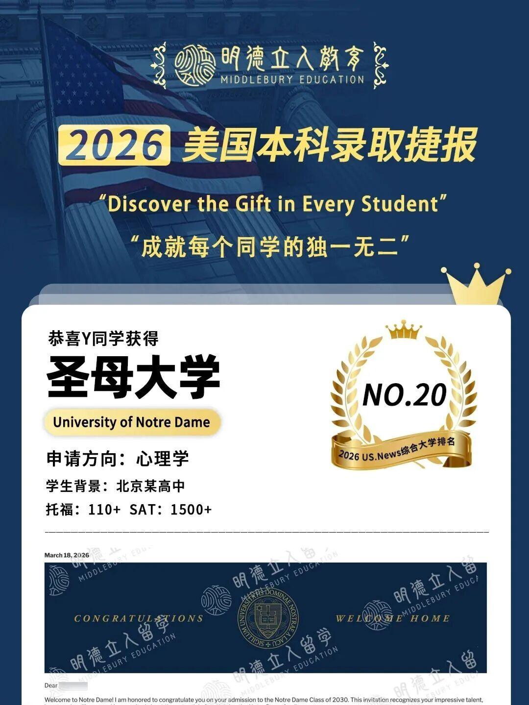 今天常规轮明德Y同学的这枚圣母大学录取更是弥足珍贵,据坊间传闻:这也是人大附ICC26fall唯一的圣母大学offer,并且获得了大中华奖学金(圣母专为中国学生设置)
