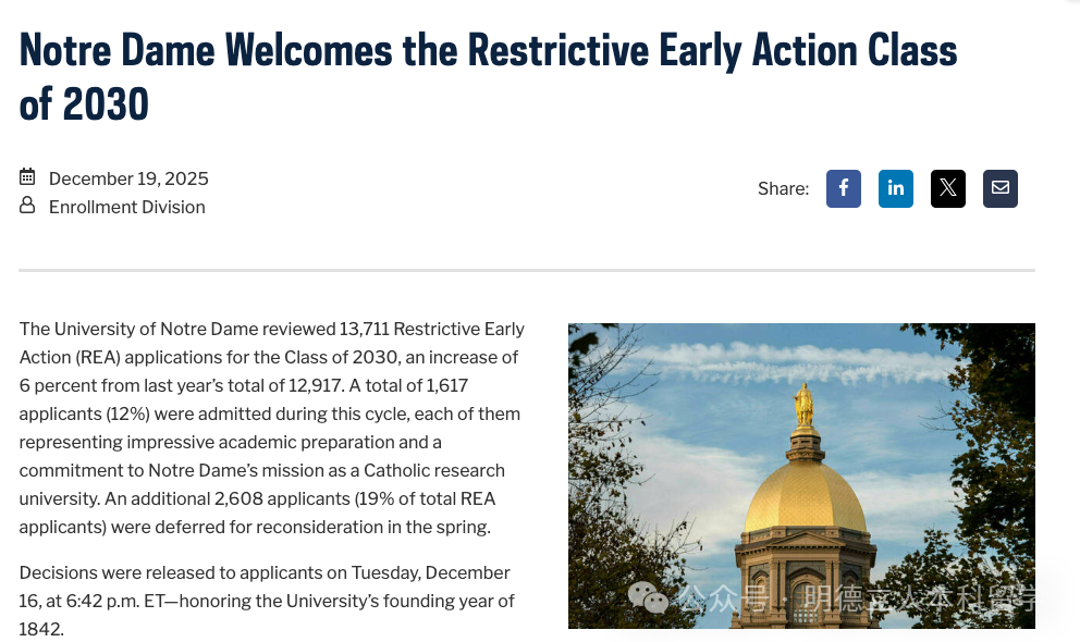 26Fall早申圣母大学REA申请量达到13,711份,同比增长6%。但录取人数为1,617人,录取率约12%,较去年继续下降。早申阶段仅向中国大陆高中发了4枚offer!