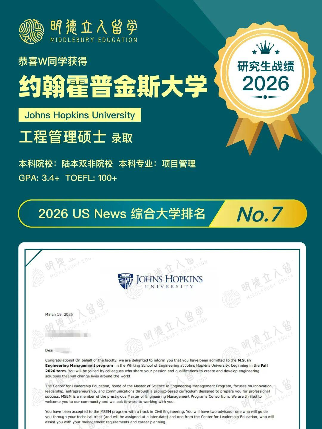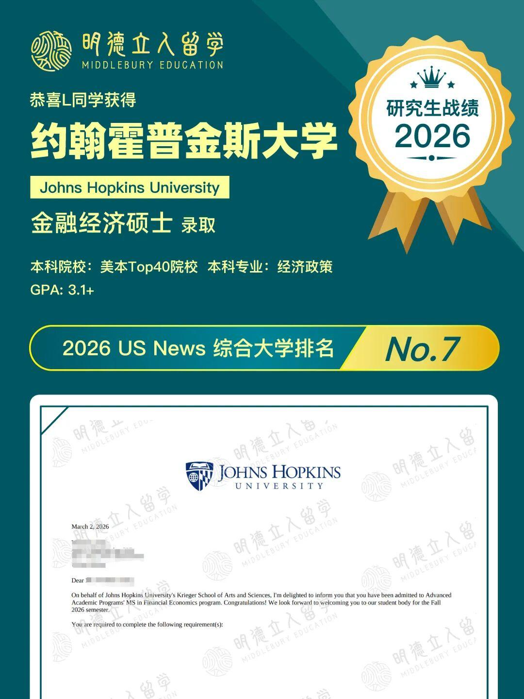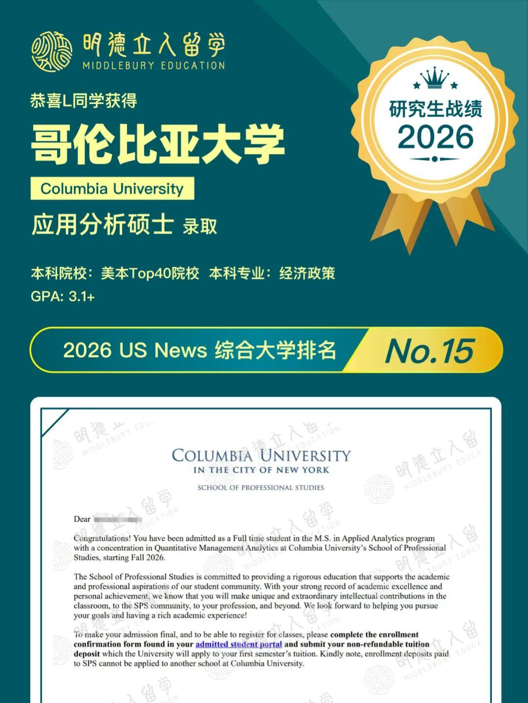 恭喜明德学子L同学,GPA3.1+,成功斩获——