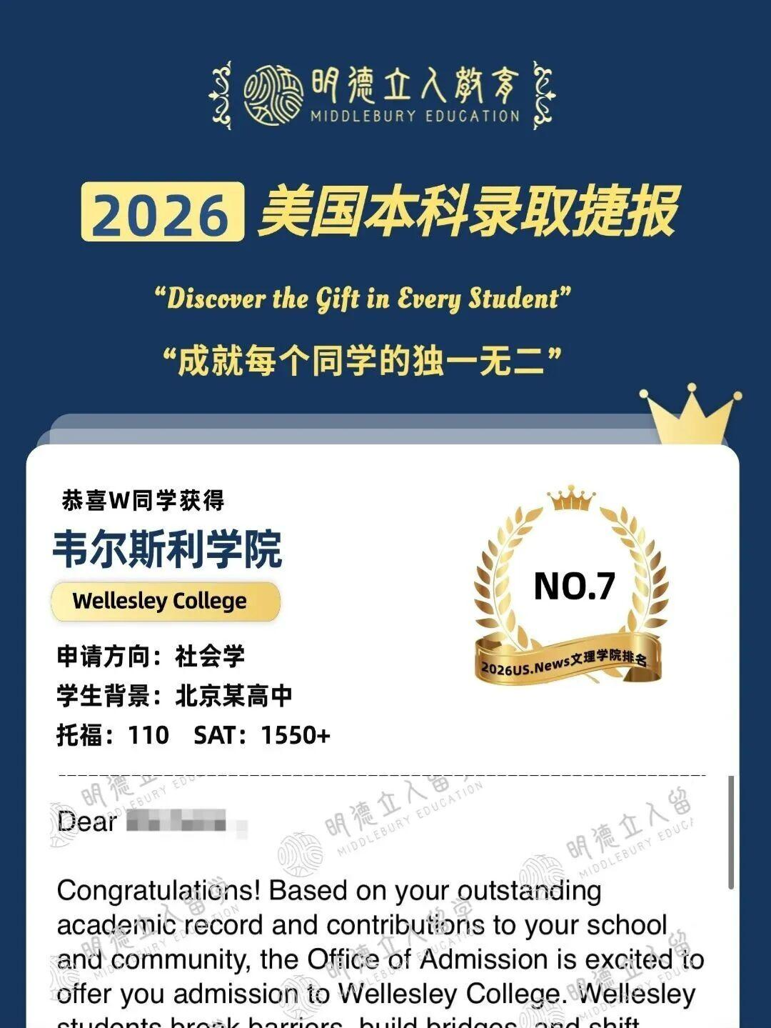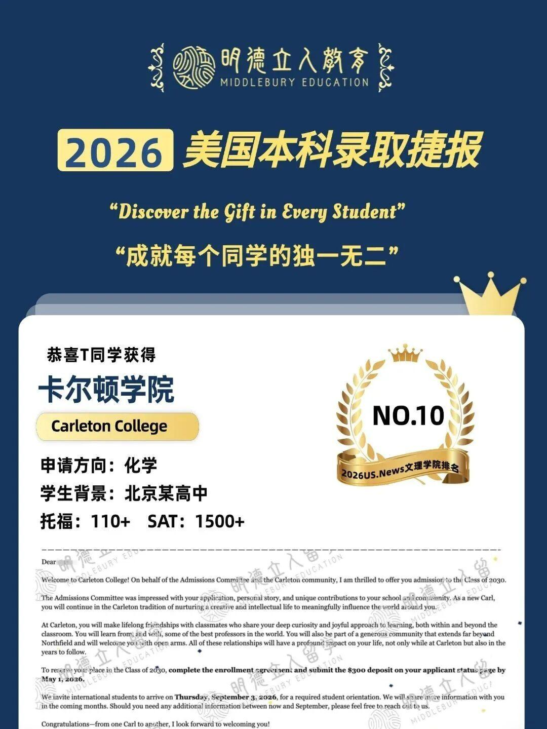 而明德W同学的这枚录取更是开荒创历史级别了,就读高中几乎没有Top10文理学院的录取历史!