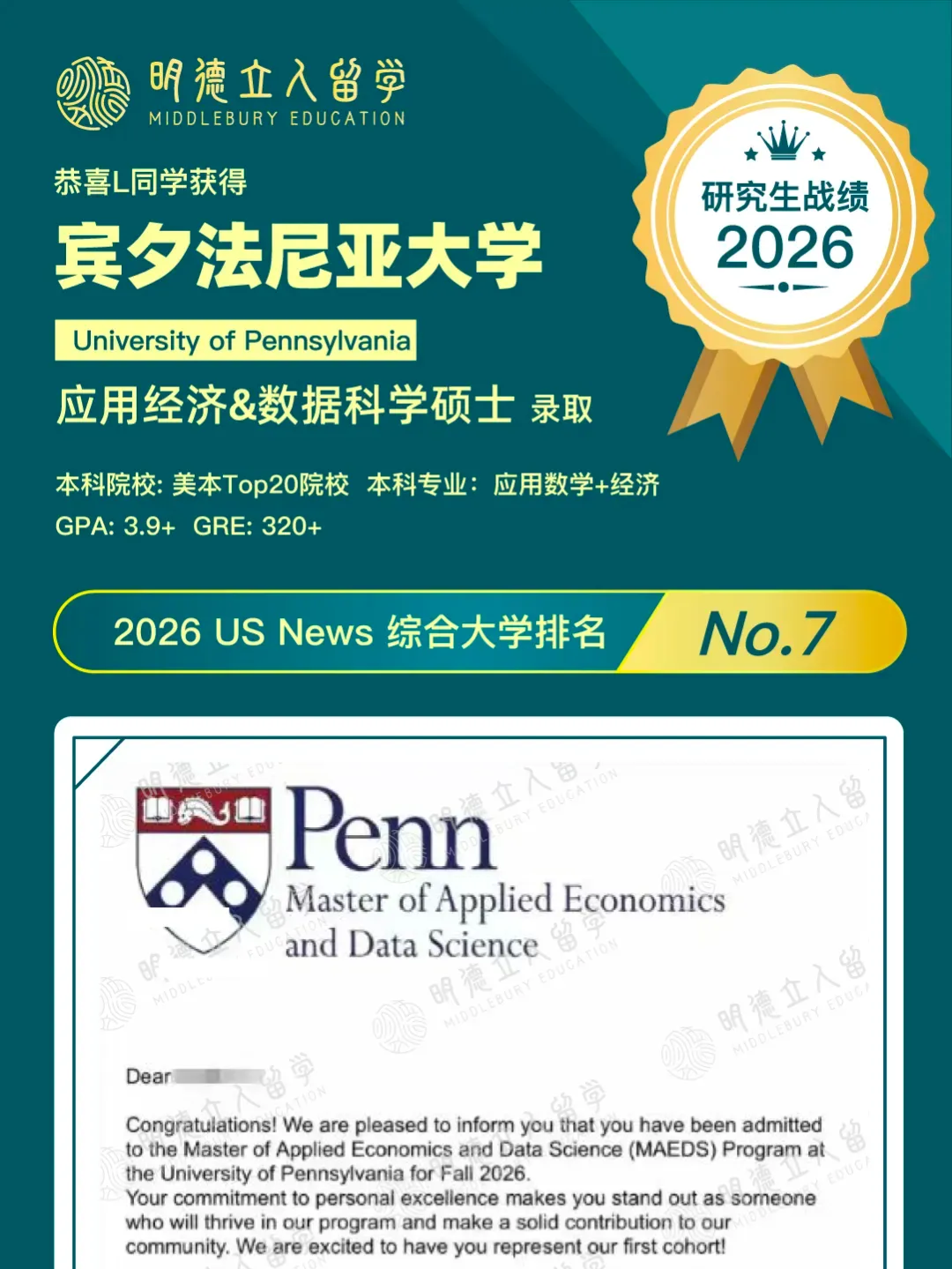 就比如拿到录取的宾大-应用经济&数据科学硕士,明德老师强烈建议TA申请!