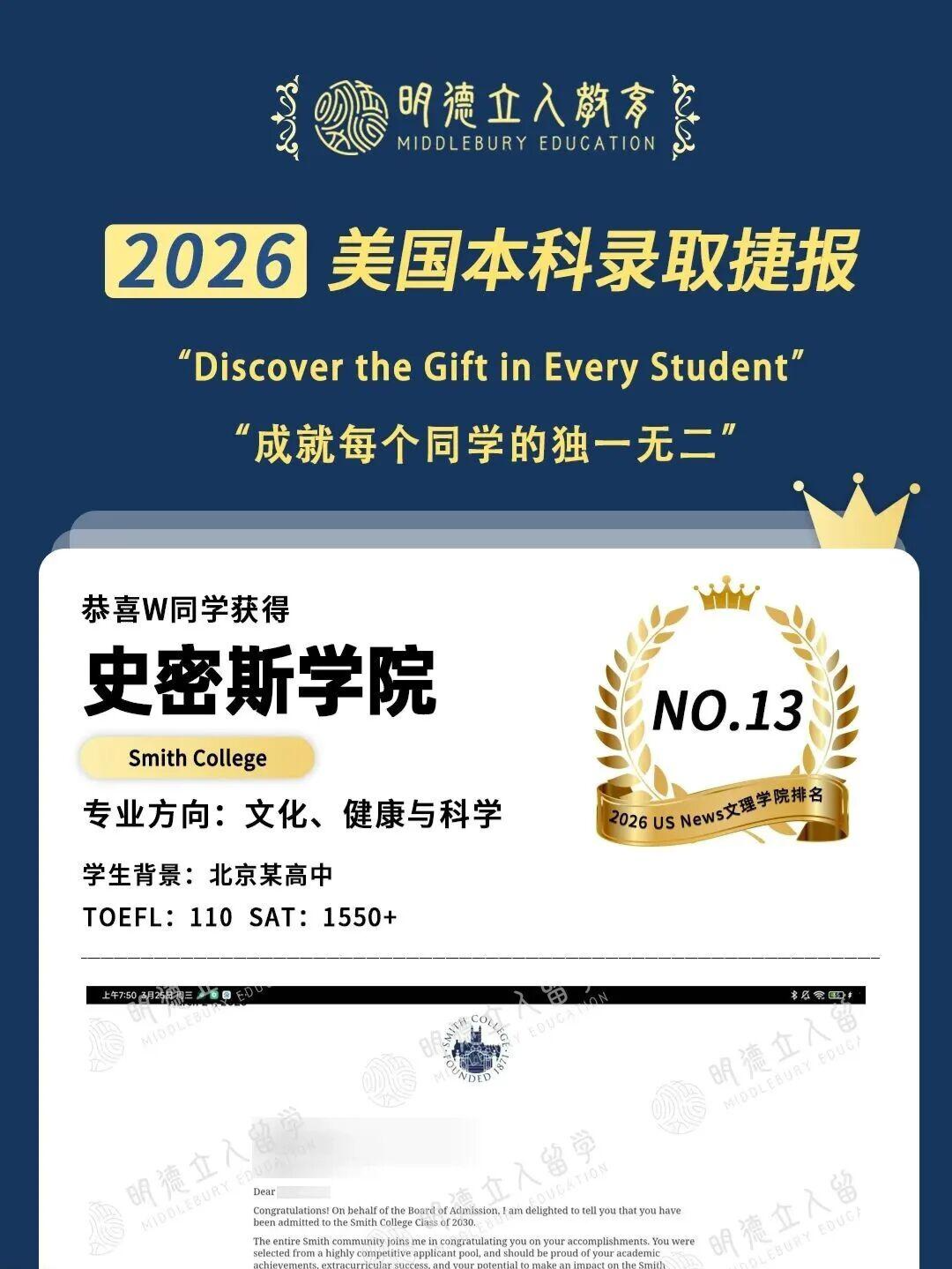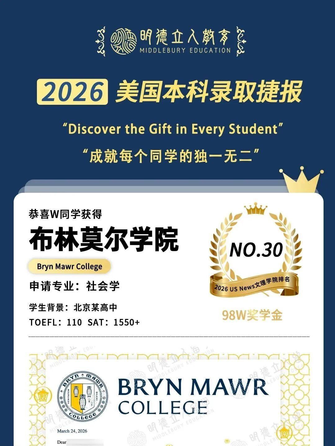 恭喜W同学继全美第一女子学院韦尔斯利学院后,天选人be like:一人拿下3枚“7姐妹”文理学院offer!!