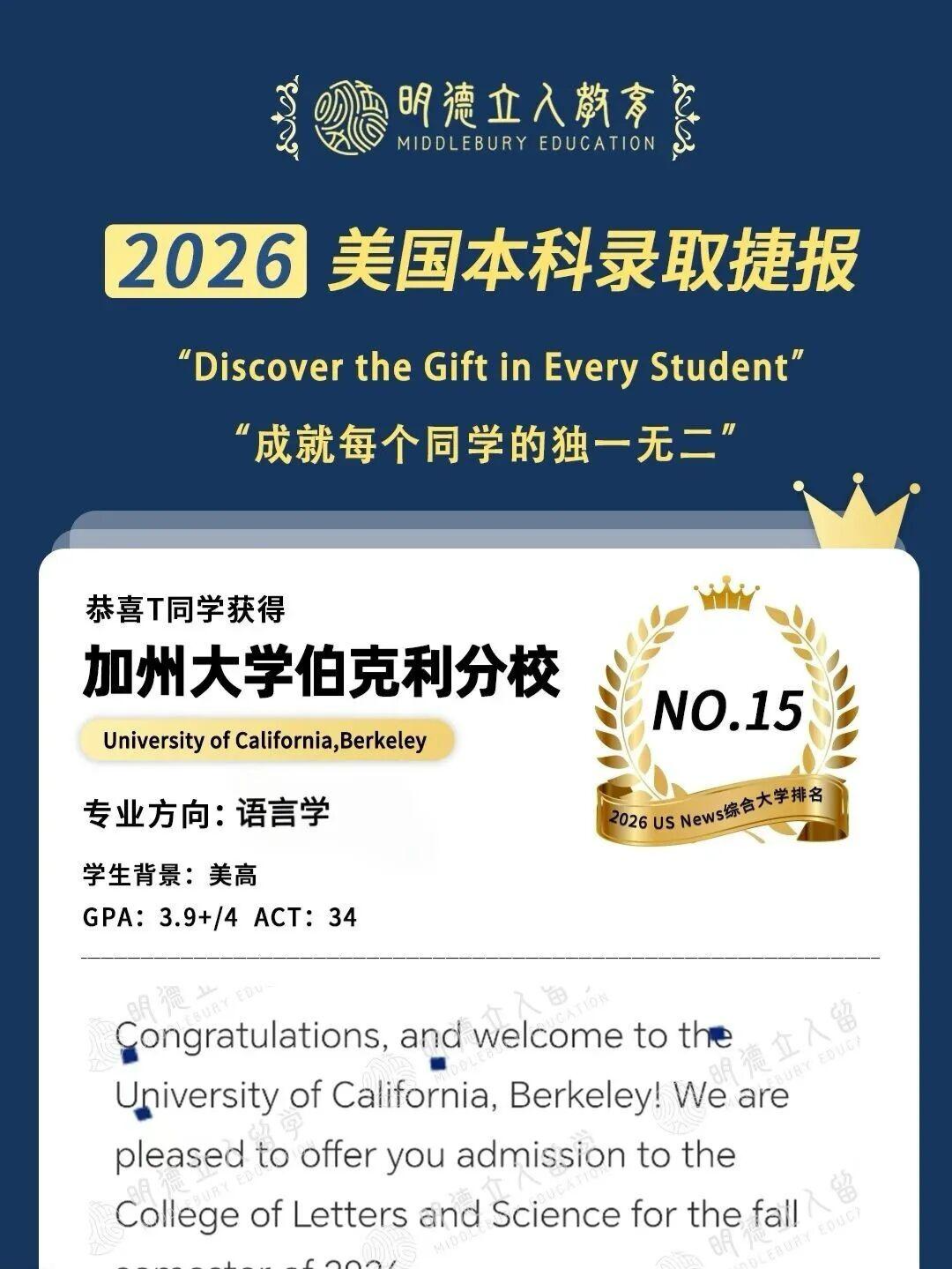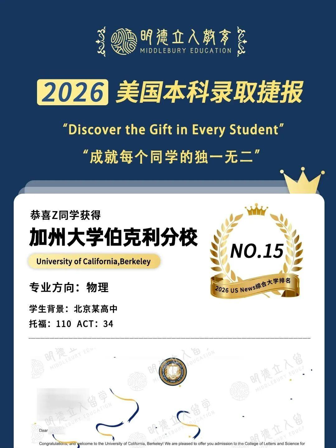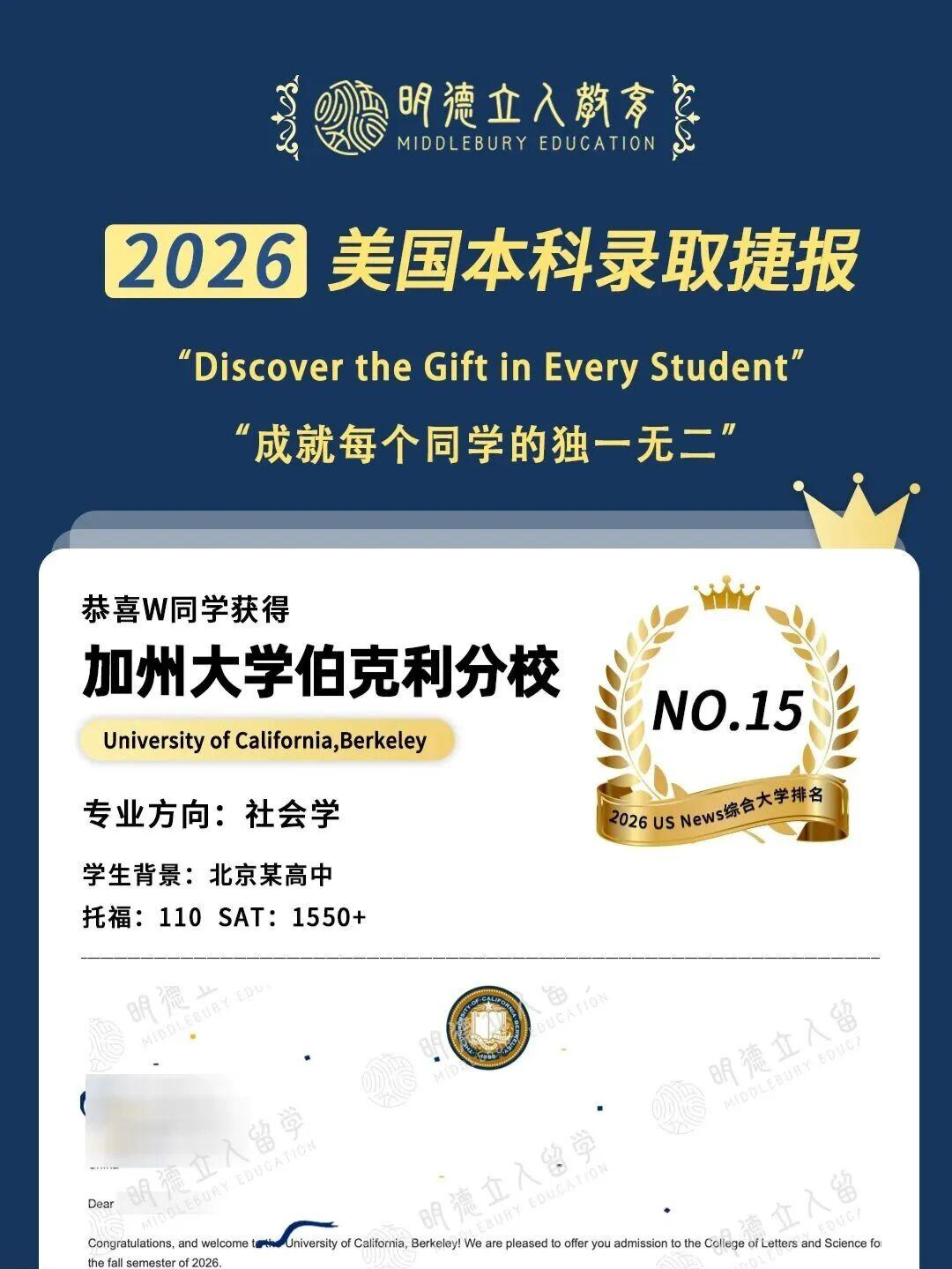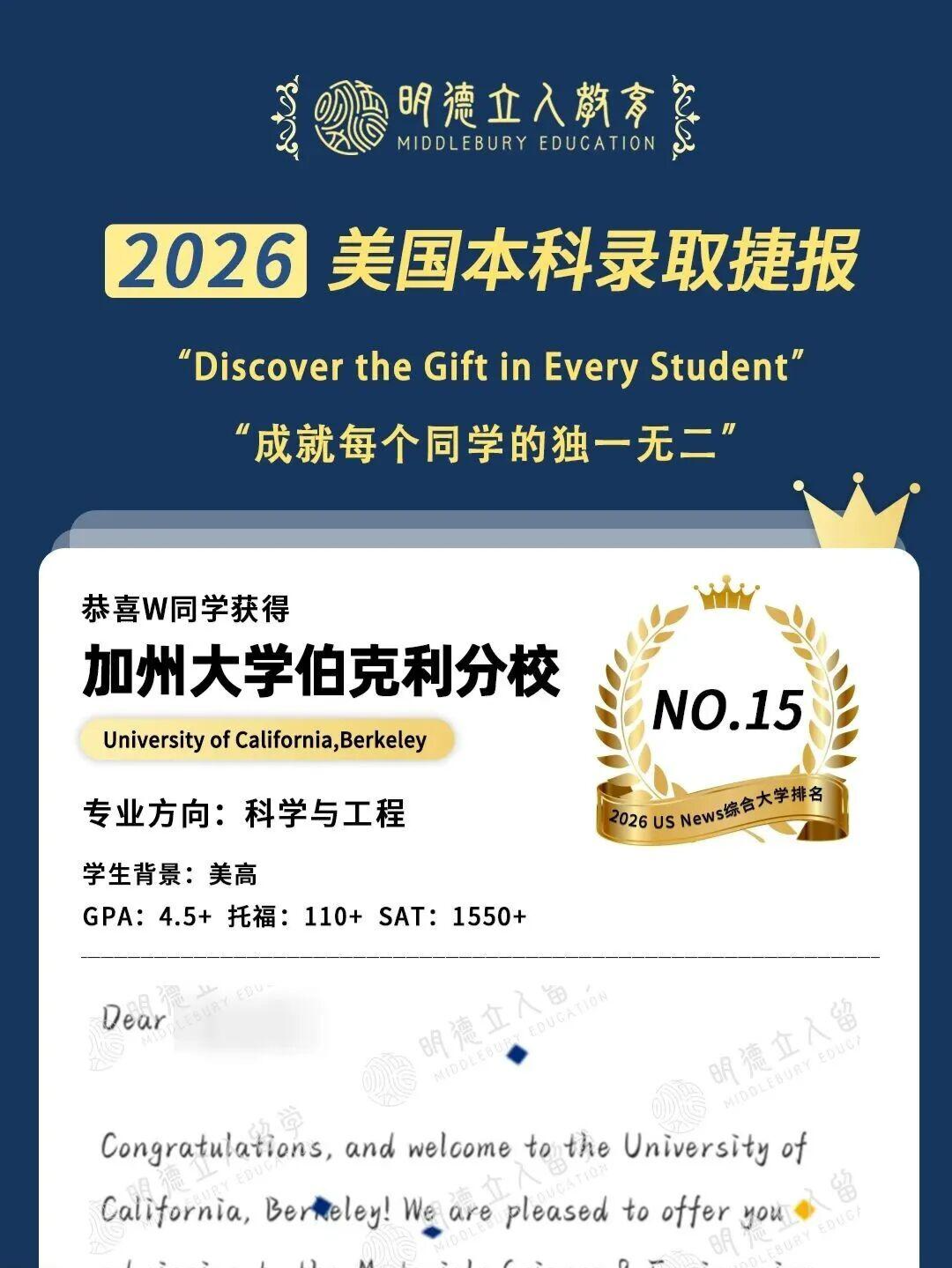 3枚藤校康奈尔大学、10枚公立第一加州大学伯克利分校(UCB)录取!!