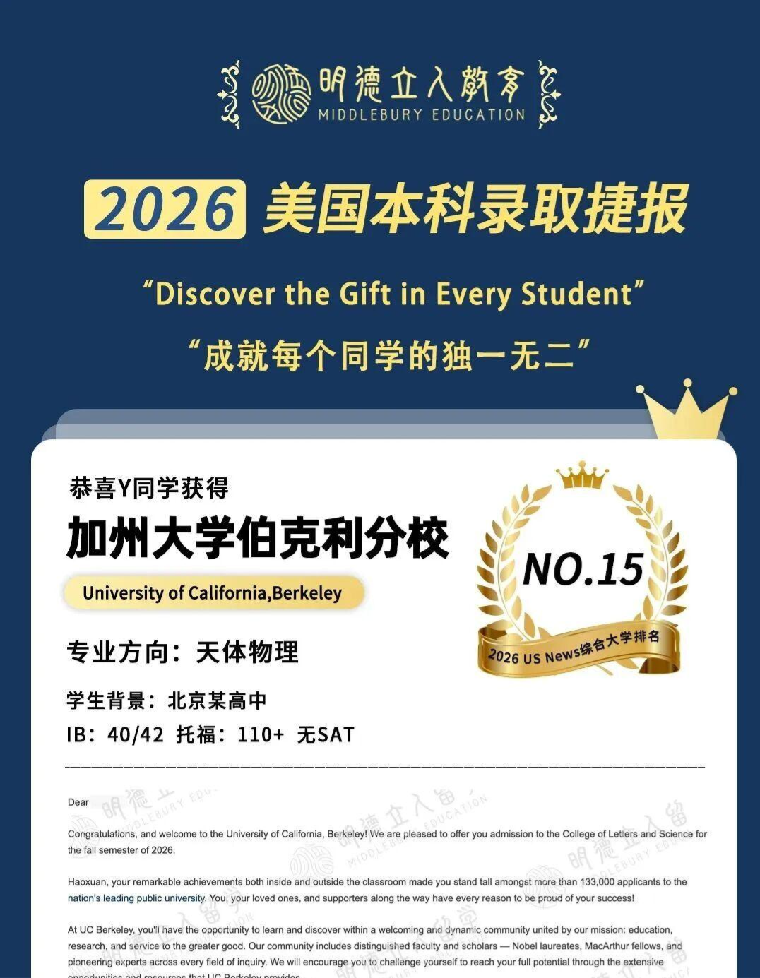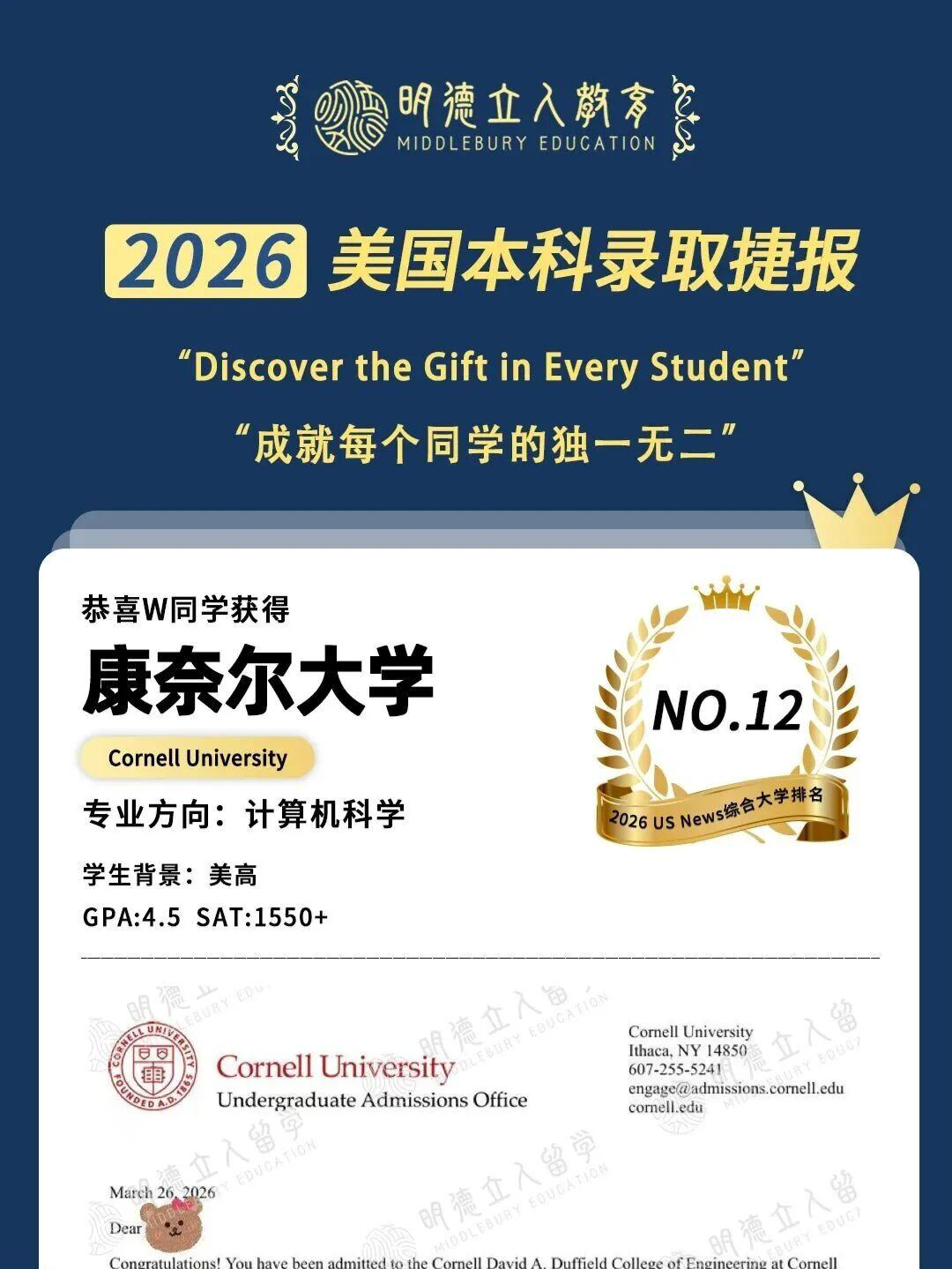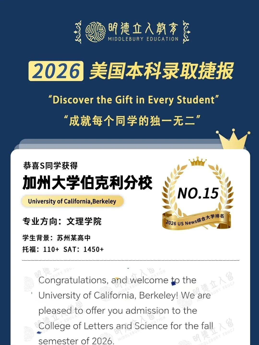 3枚藤校康奈尔大学、10枚公立第一加州大学伯克利分校(UCB)录取!!