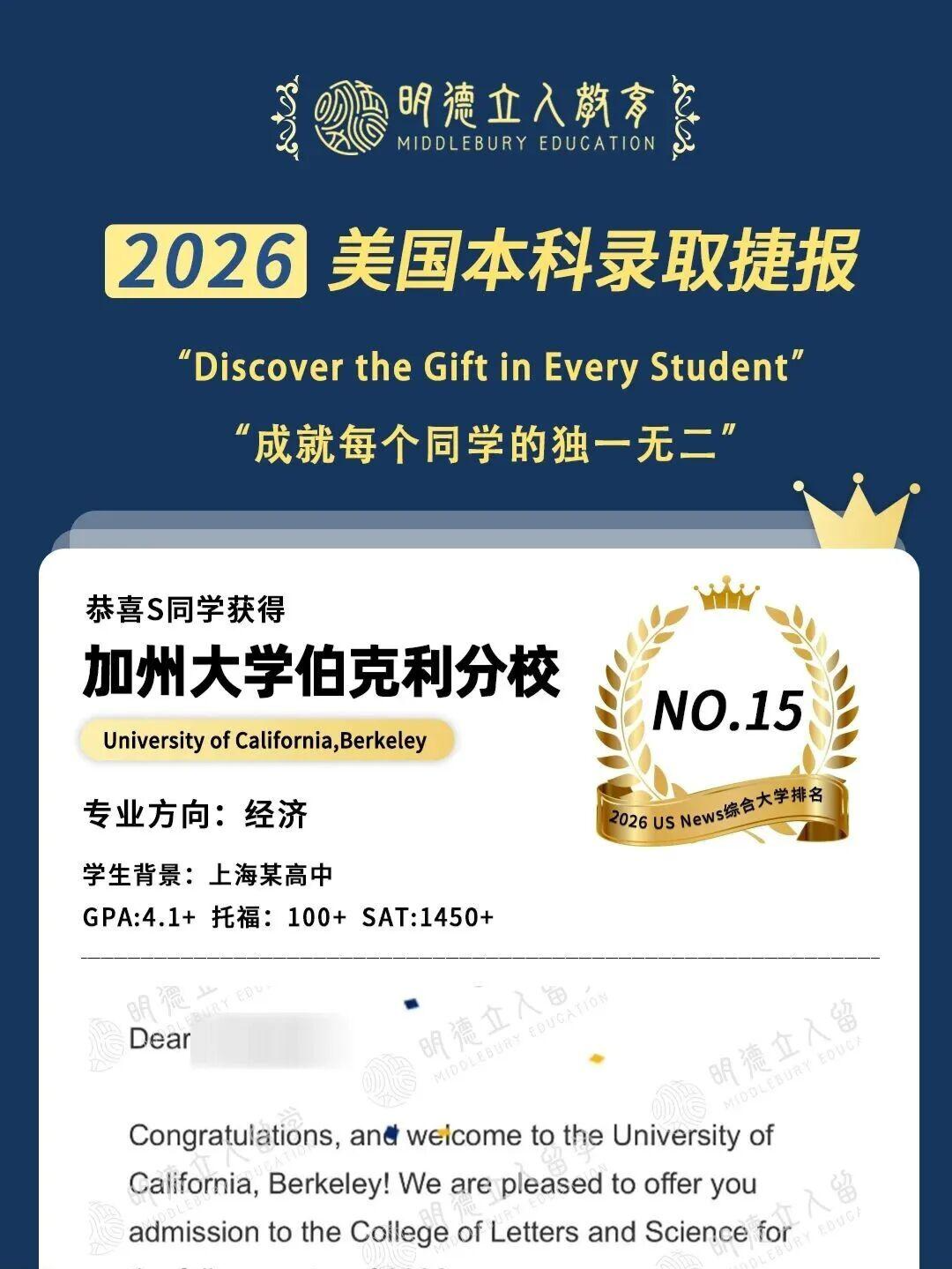 S同学标化不算顶尖仍凭出彩的个人特质和家长认证的“最佳团队”共同努力录取UCB经济,是学校院长直接打电话给家长报喜的重磅Offer!!