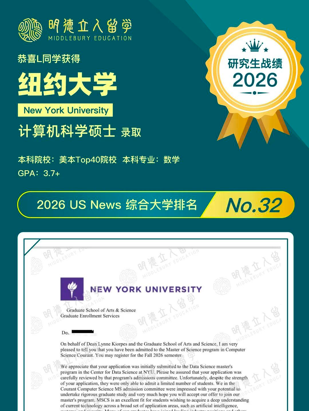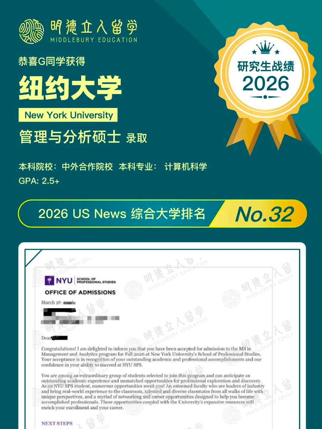 恭喜明德学子G同学,GPA2.5+,成功斩获——