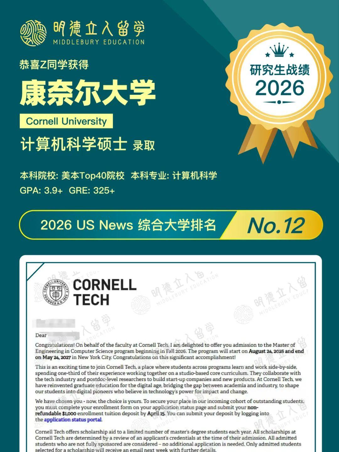 到研究生申请时,面对冲击美国CS顶校的目标,Z同学再次选择将这份信任托付给明德!