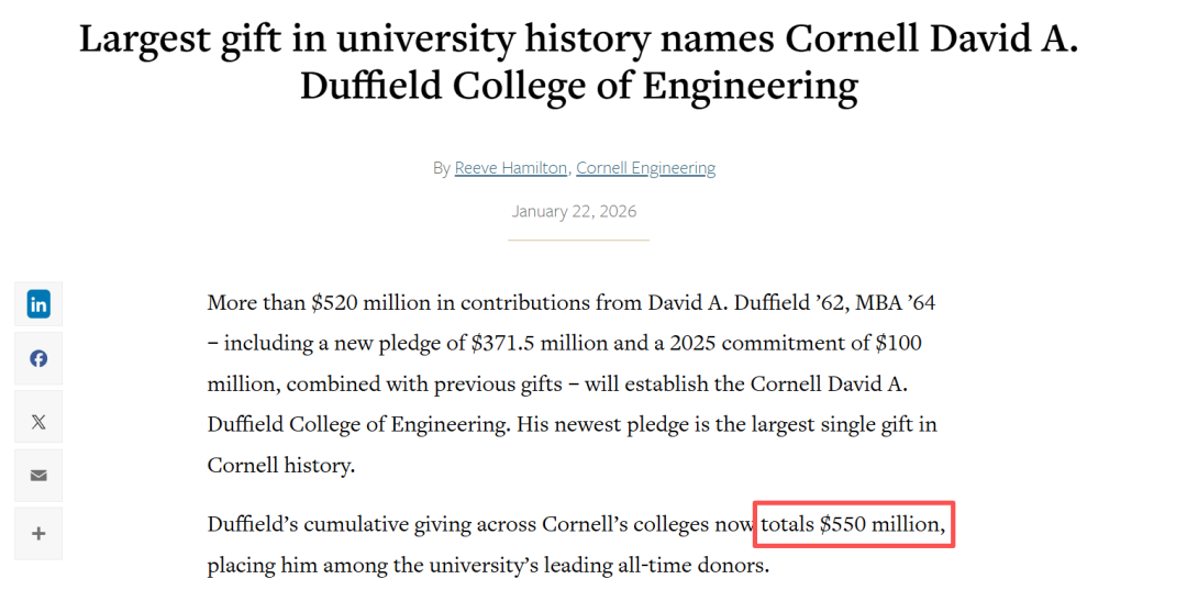 这是康奈尔大学成立以来金额最高的一次个人捐赠。加上此前的多次支持,Duffield对康奈尔的累计捐赠总额已超过5.5亿美元,使其成为学校历史上最重要的捐赠者之一。