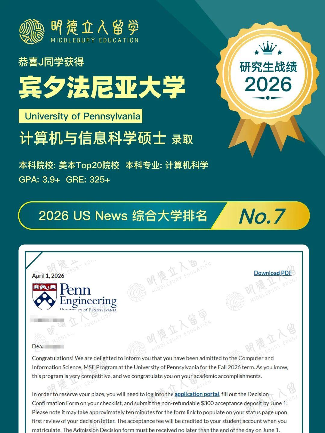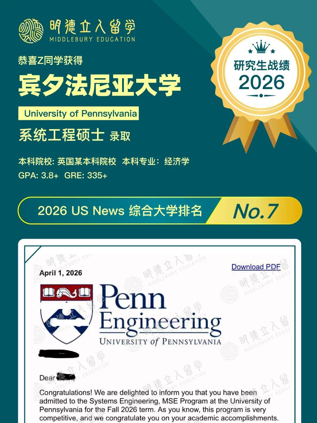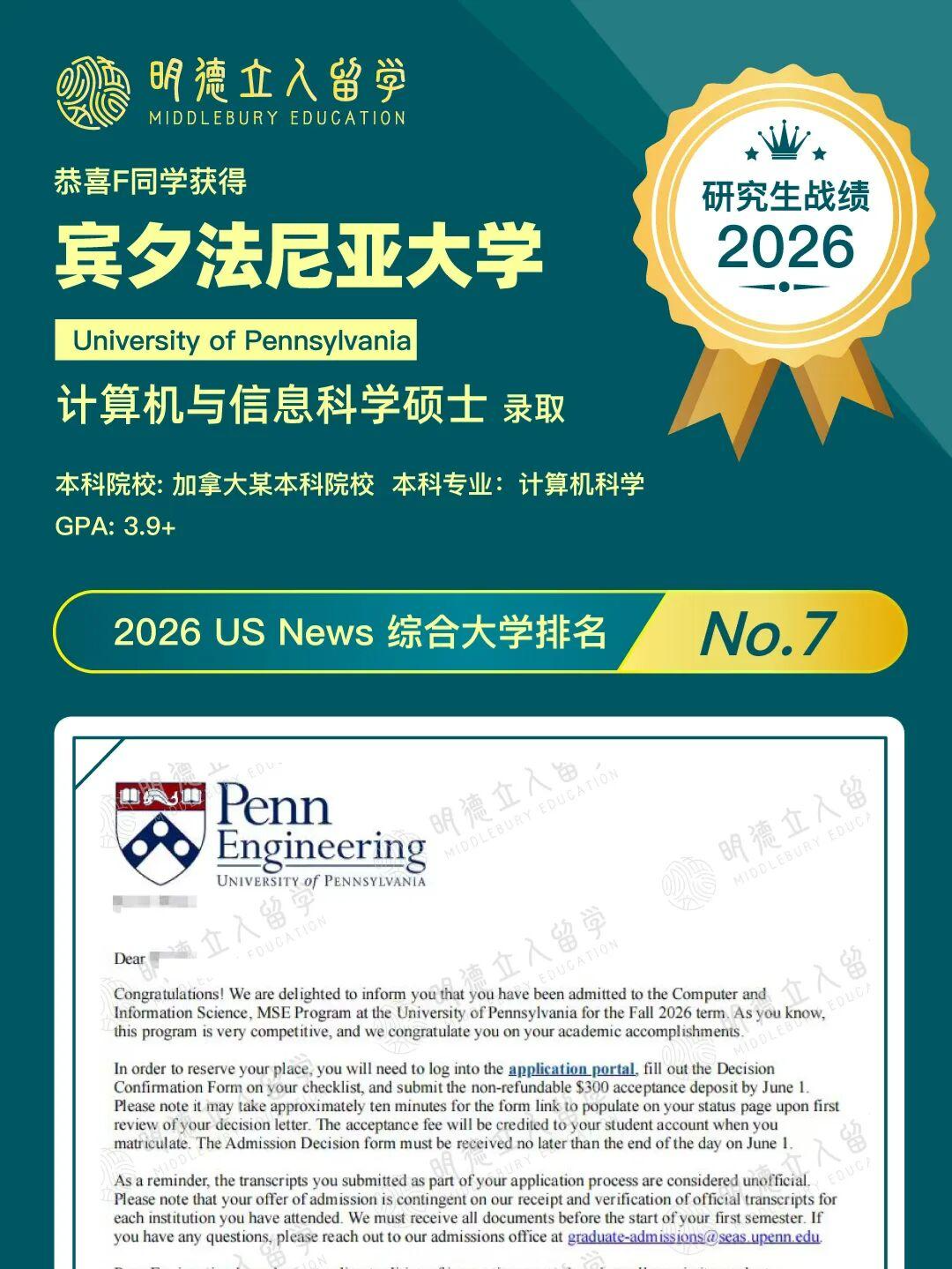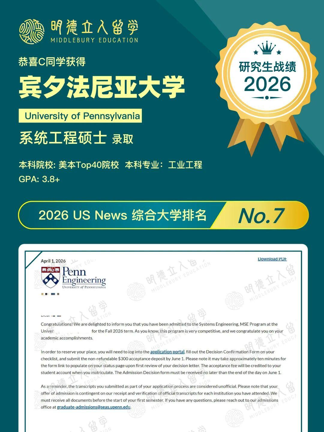 7枚宾夕达尼亚大学录取到!!
