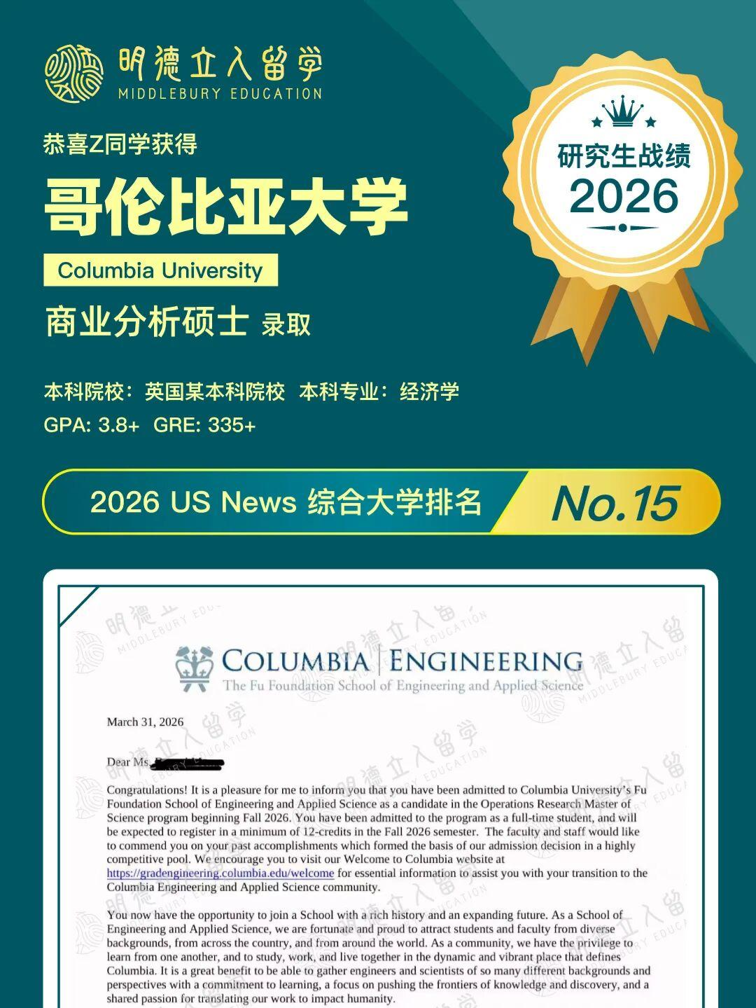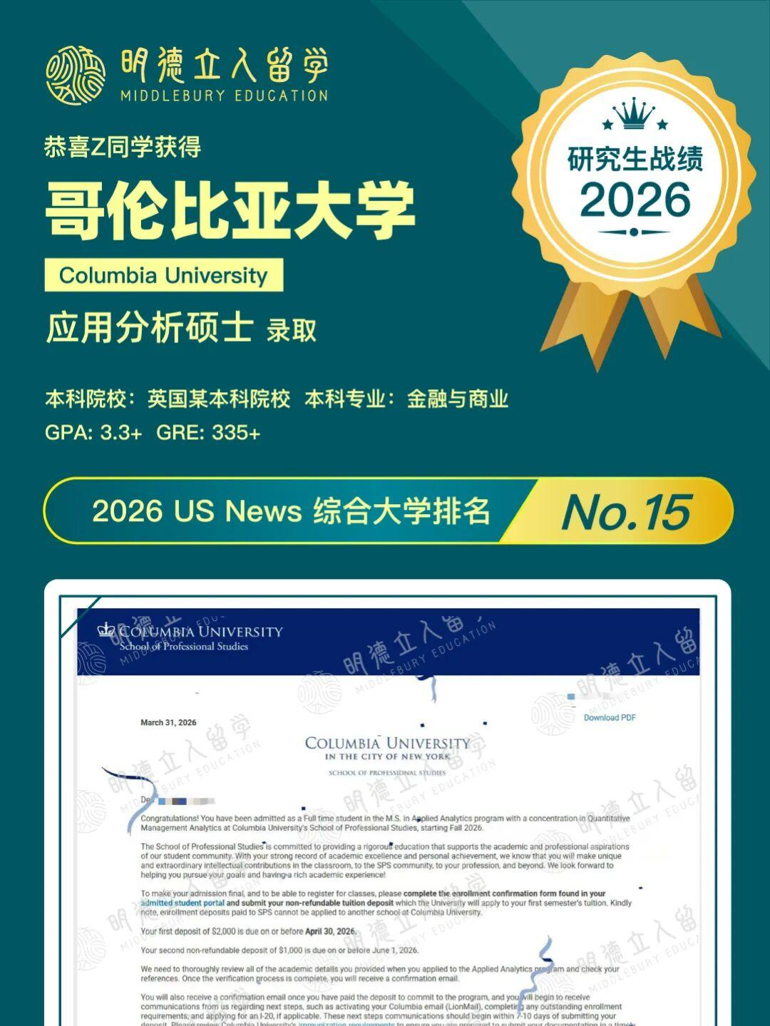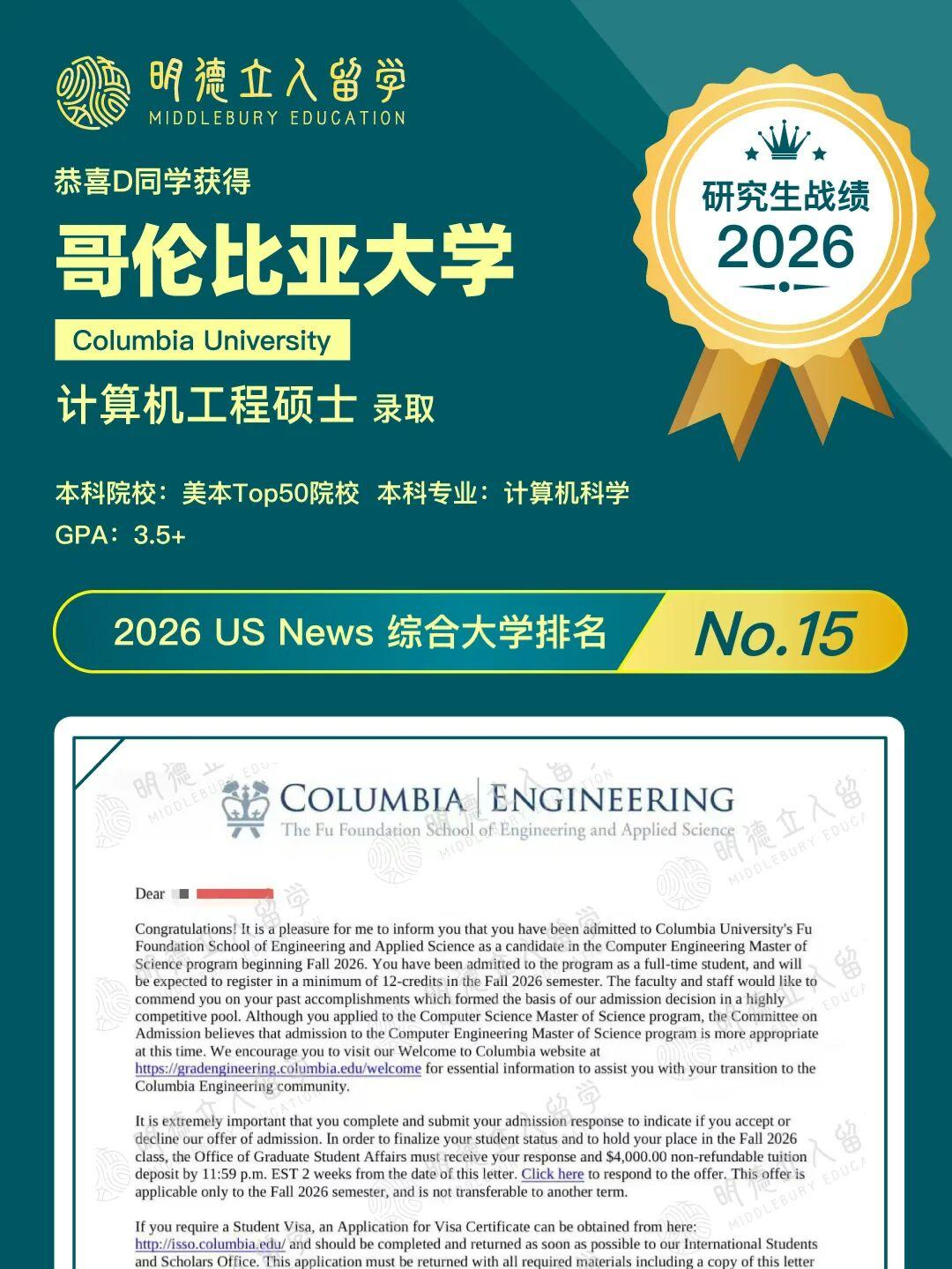 恭喜明德学子Z同学,GPA3.3+,成功斩获——