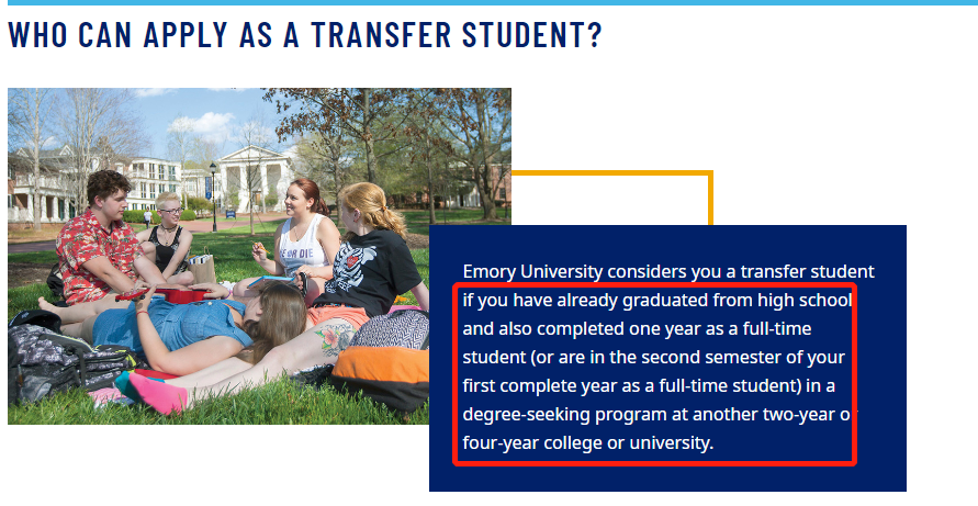 埃默里大学要求已经从高中毕业且完成了一年大学学习的学生才能申请,即它只接受大二和大三学生的转学申请。