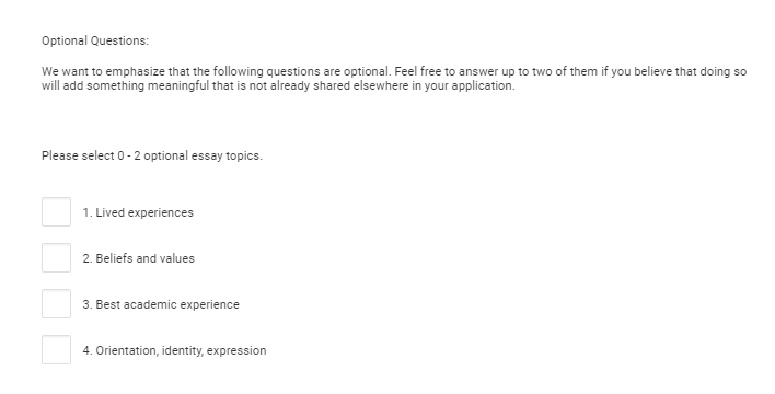 另外转学除了Why ttransfer也会有其他大大小小的文书,杜克大学在基础的两个why类文书题目外,还要在以下问题中选择2个回答: