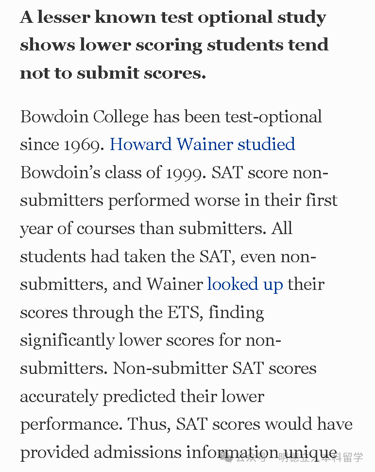 自1969年起,鲍登学院便实施标化可选政策,研究发现,未提交SAT成绩的学生在大学第一学年的课程表现,普遍不如提交成绩的学生。
