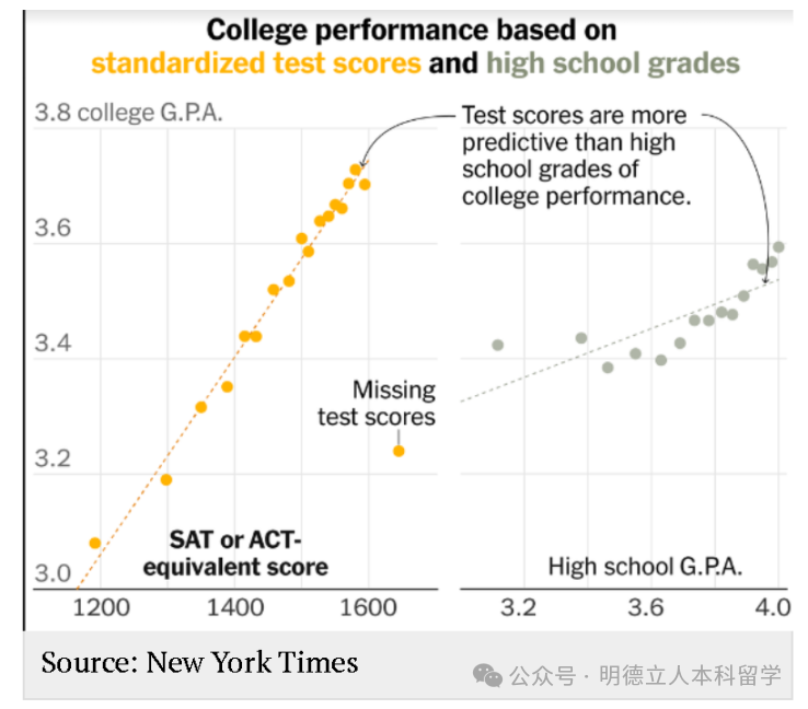 《纽约时报》曾对比 SAT/ACT 分数与高中GPA对大学 GPA的预测效力: