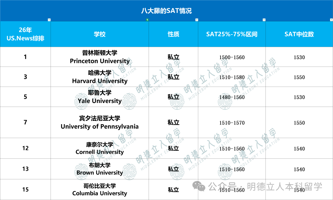综合来看,八大藤校的SAT中位数集中在1530-1550分区间,而这只是一个中间位置的水平。