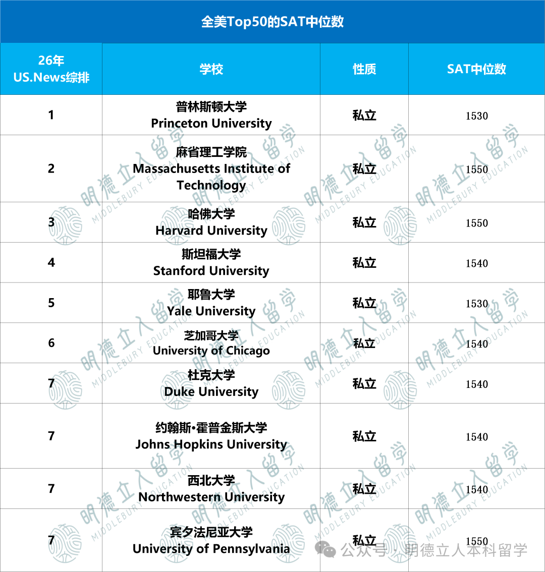 其中全美Top10的SAT中位数就没有低过1530分的,MIT、哈佛和宾大的SAT中位数更是达到1550分。