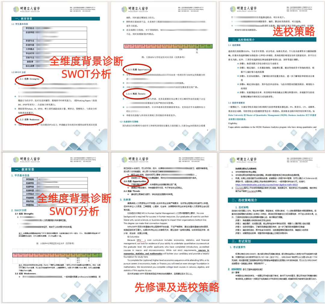 (1)全维度背景诊断:SWOT分析,剖析你的学术背景、实习/科研经历、语言等,挖掘优势,点明短板,提供先修课策略;