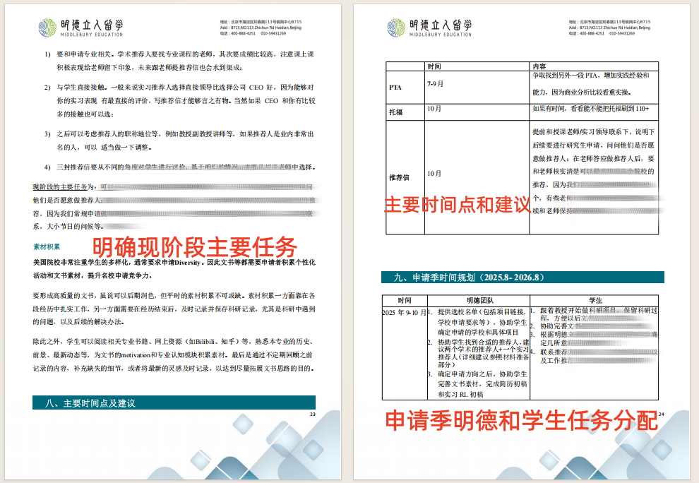 (2)文书和推荐信建议:针对目标项目不同院校的喜好,规划时间线、素材积累等内容;