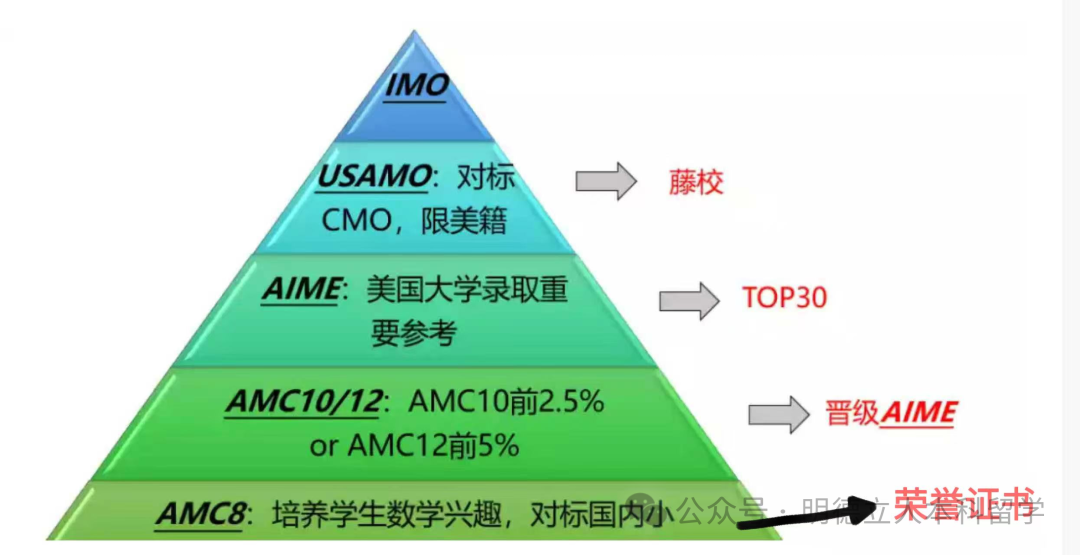 数学方向:从AMC系列起步(AMC8/10/12),9年级应该冲AMC10,如成绩不错,就能顺势挑战AIME,后续再冲击USAMO。这条路超级稳,招生官一看就知道孩子数理基础扎实。