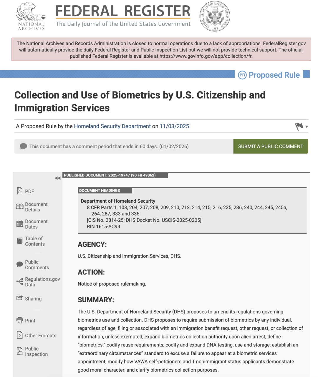 👉DHS 在声明中称,推出该新规是为了 “强化身份验证流程、提升安全防护能力、防范移民欺诈行为”。