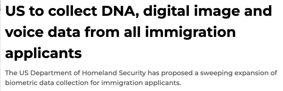 意为 “美国将向所有移民申请人采集 DNA、数字图像及语音数据”