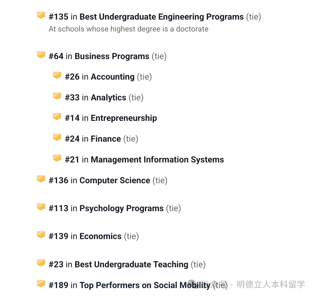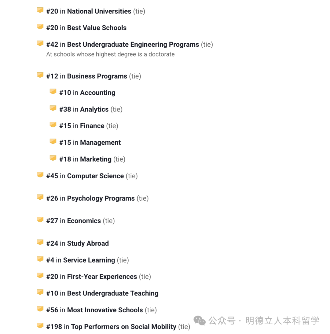它的商科项目一流,在全美排名第12,其中细分领域的市场、管理、会计、金融都在前20名。