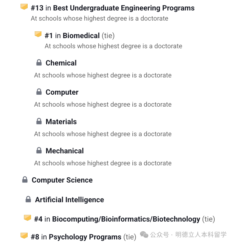 工程项目在全美第13,其中生物医学工程称霸全美,乃至全球;生物计算/生物信息学/生物技术全美第4;心理学第8。