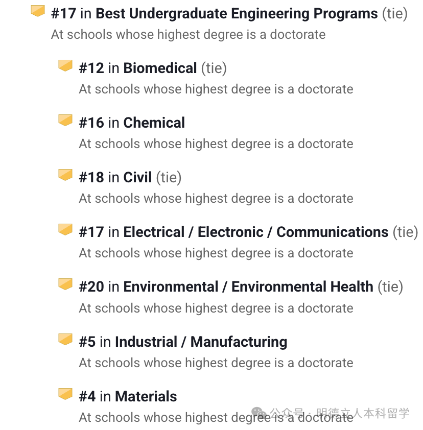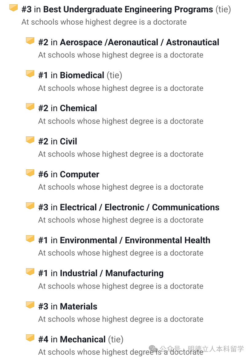 本科工科全美排名第3,细分领域个个都是“王牌”,土木、工业、生物医学、电气、航空航天、化学、环境健康、材料等均是全美前3的水平。