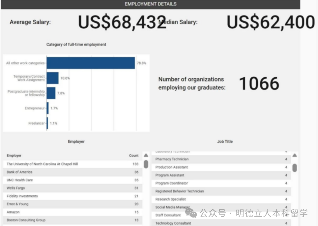 北卡罗来纳大学教堂山分校2024届本科毕业生的就业去向率高达98.86%,有1066家机构吸纳了其毕业生,平均起薪是68432美元。