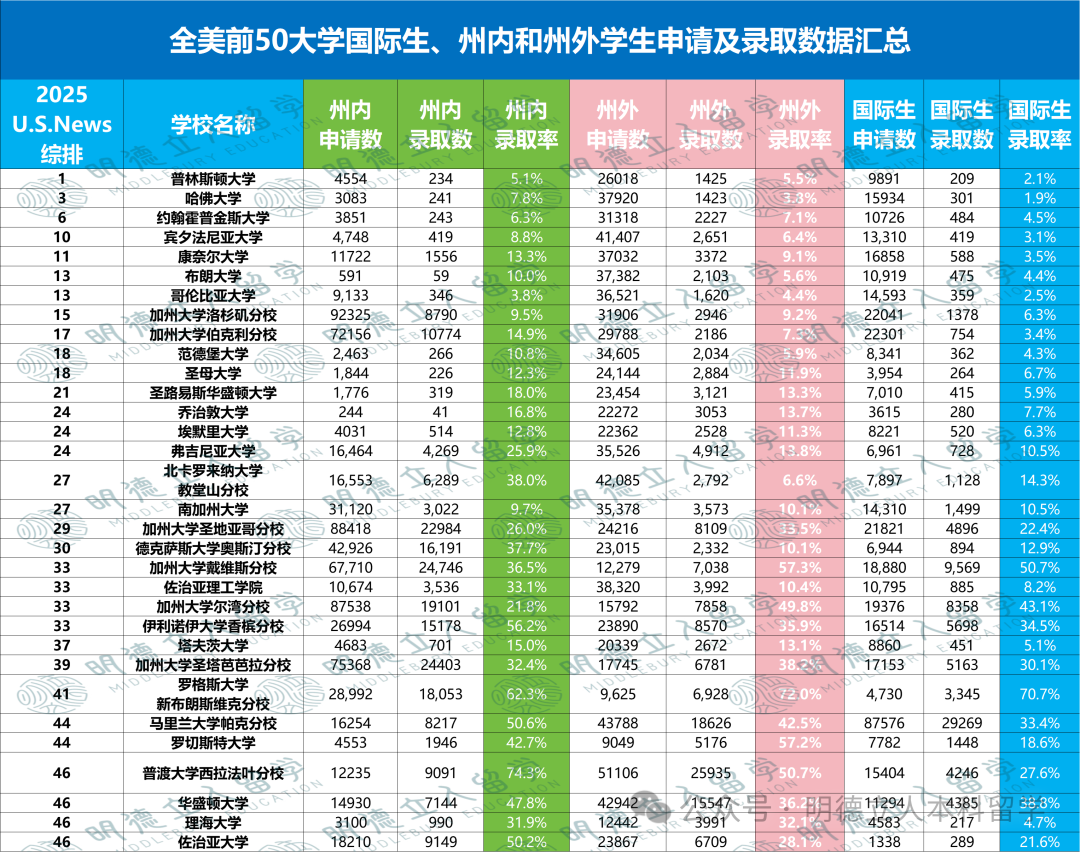如果说热门专业难申是 “对内卷”,那国际生录取就是 “对外双重卷”。这 5 所公立校中,有3所的国际生录取率低到令人咋舌,甚至超过部分藤校。