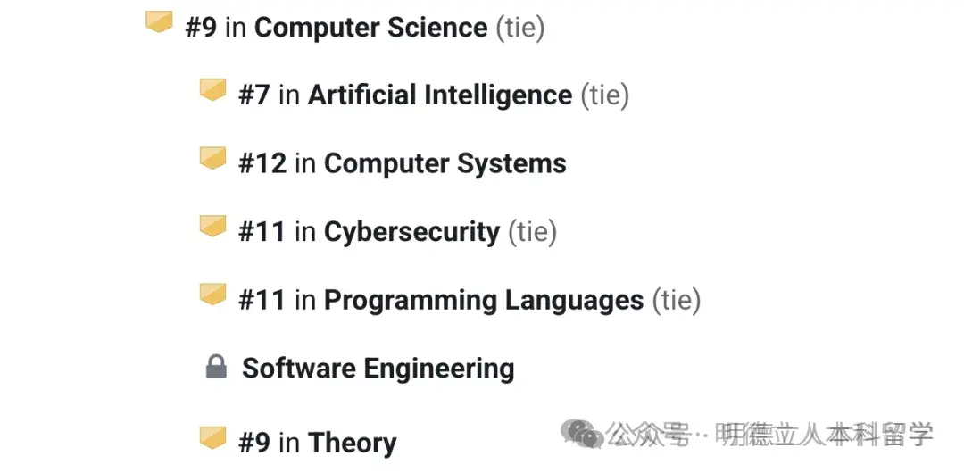 会计专业全美第1;计算机科学全美第5,其中人工智能、编程语言第6;计算机系统第4;网络安全第7等。
