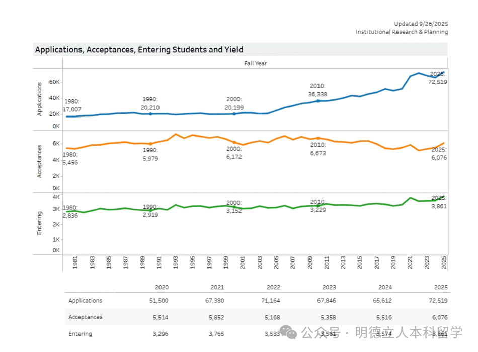 2025 Fall共收到124,214份申请,录取了35,661名新生,只有约6,369人选择入学。