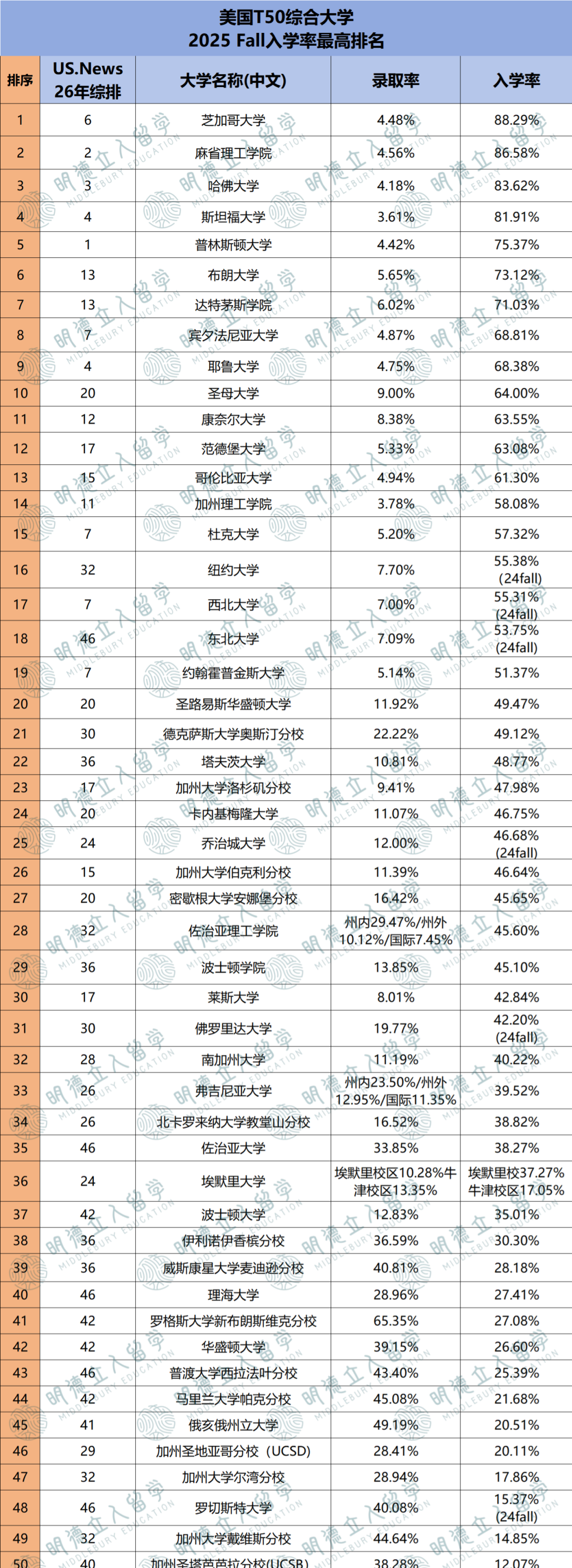 美国Top50大学最新入学率排名