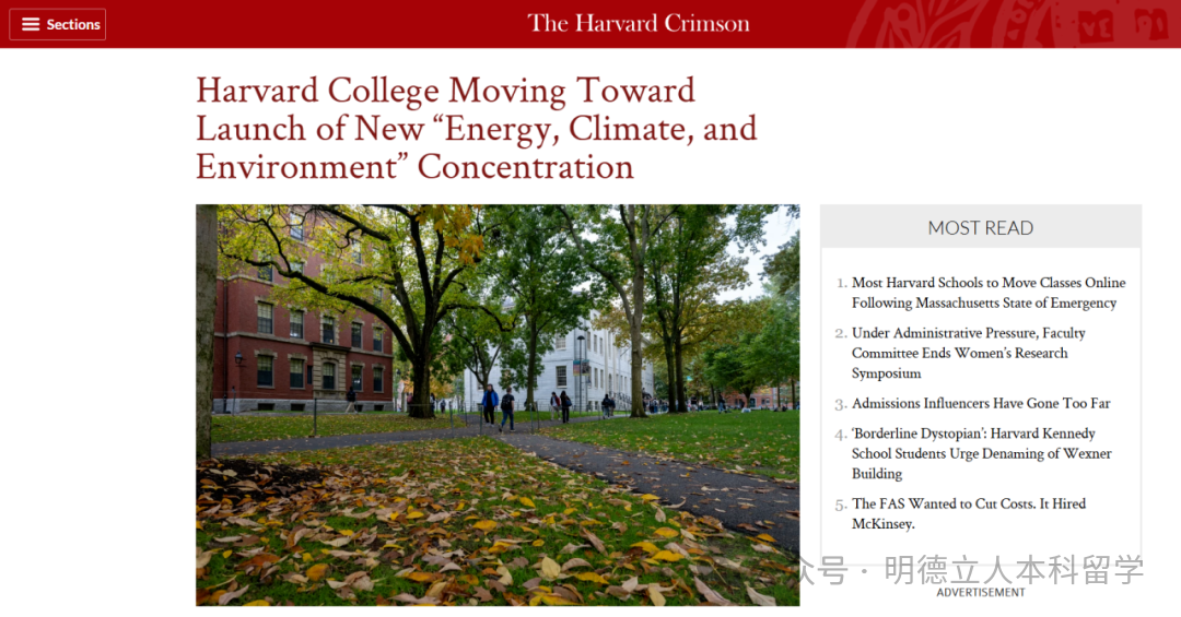 哈佛计划在2026年秋季启动了其近十年来首个全新的本科主修专业:能源、气候与环境(ENCE)。