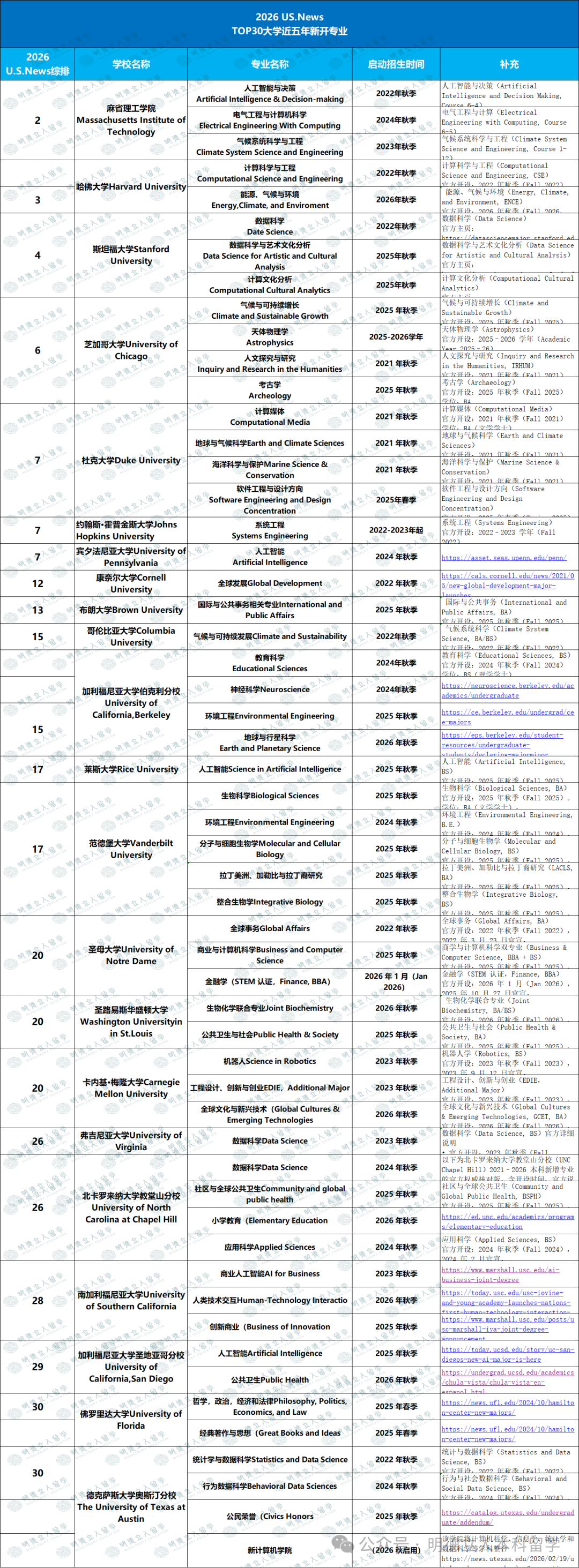 为验证这一观点,小藤爬遍官网整理了一份最新资料:近5年(2021-2026),美国TOP30名校新开专业大盘点——