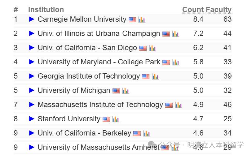 而UCB和马萨诸塞大学阿默斯特分校则是并列第9名,成为AI领域的Top10尾巴。