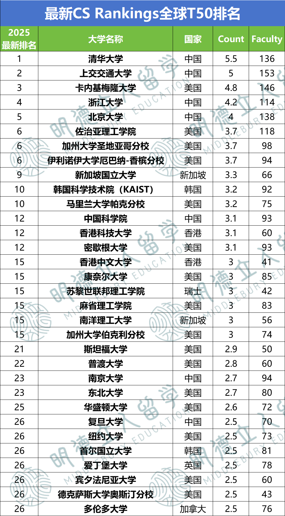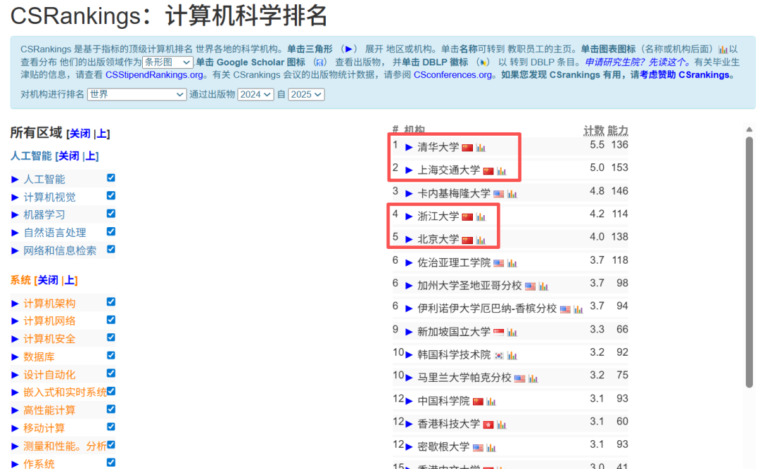 还有浙江大学、北京大学,共同进入了全球前无,中国共计9所大学上榜,可以看出中国在CS领域的快速崛起!