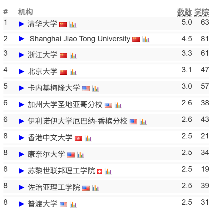 上海交通大学则是超越了卡耐基梅隆大学,来到总榜第三名的位置。