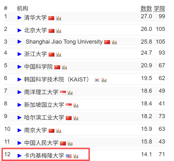 人工智能专业榜单巨震!原来排名第一的卡梅不见踪影,中国大学和亚洲的多所大学冲上前11,而卡内基梅隆大学则位于12名!