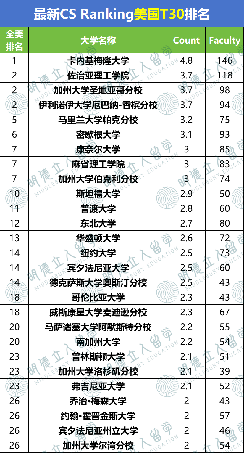 康奈尔、MIT和加州大学伯克利分校并列第7,在前30中,还有UCLA(第23名)和UCI(第26名)上榜。