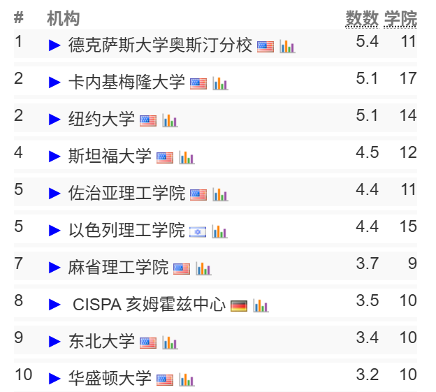 让人叹服的是亚利桑那州立大学(US.News综排121)、乔治梅森大学(US.News综排109)在CS Rankings中均进了前30的大门。