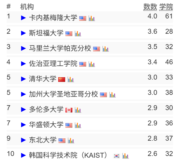 6-10名:佐治亚理工学院、加州大学圣地亚哥分校、伊利诺伊大学厄巴纳-香槟分校;新加坡国立大学;韩国科学技术院;密歇根大学;