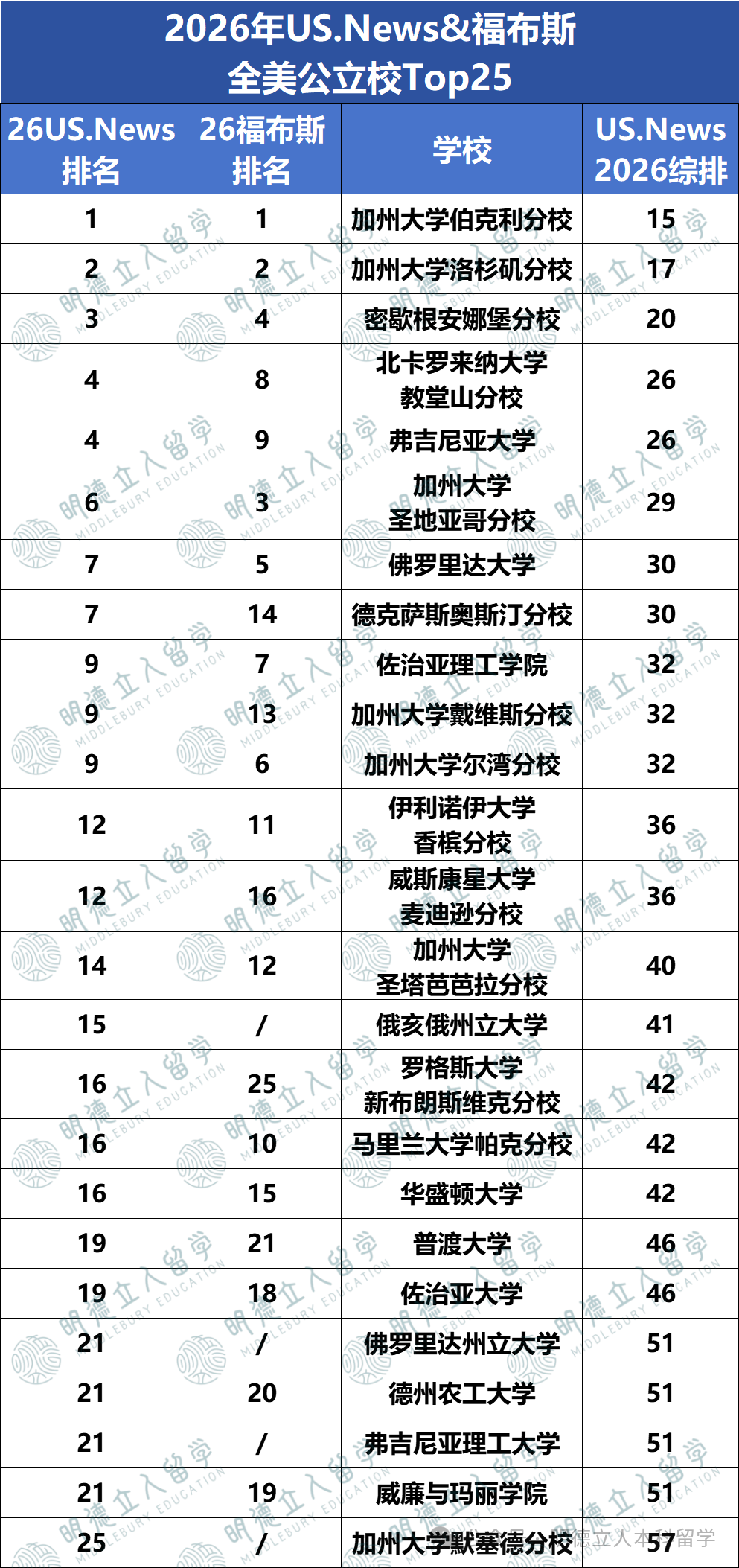 今天小藤来给大家全面剖析2026年美国公立校情况,整合了留学必看的「2026年US.News全美最佳公立大学榜单」和《福布斯》评选的2026年度实力最强的25所公立大学信息,看看究竟哪家才是公立校最强者!
