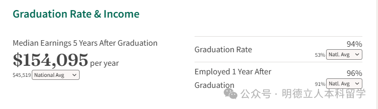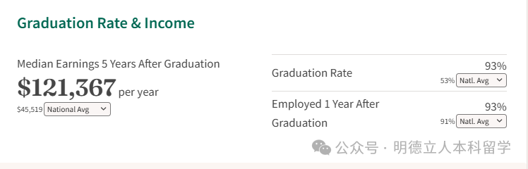 就业和薪资表现也强的没话说,毕业五年后收入中位数每年达到121,367美元,远超45,519美元的全国平均水平;