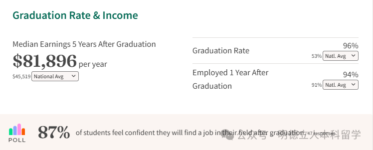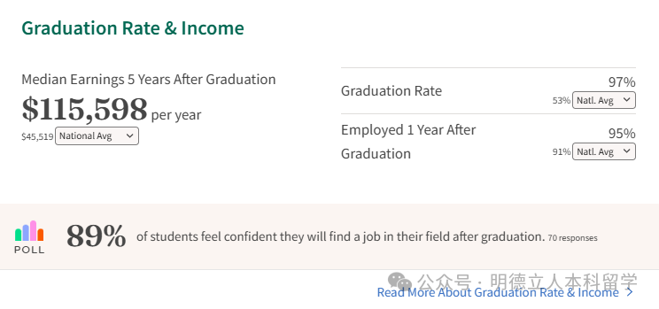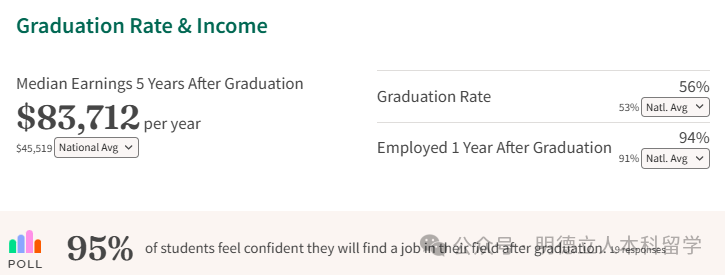 毕业生的就业和深造表现也很亮眼,毕业后五年的薪资中位数达到 83,712 美元,95%的学生对毕业后找到本专业相关的工作充满信心。