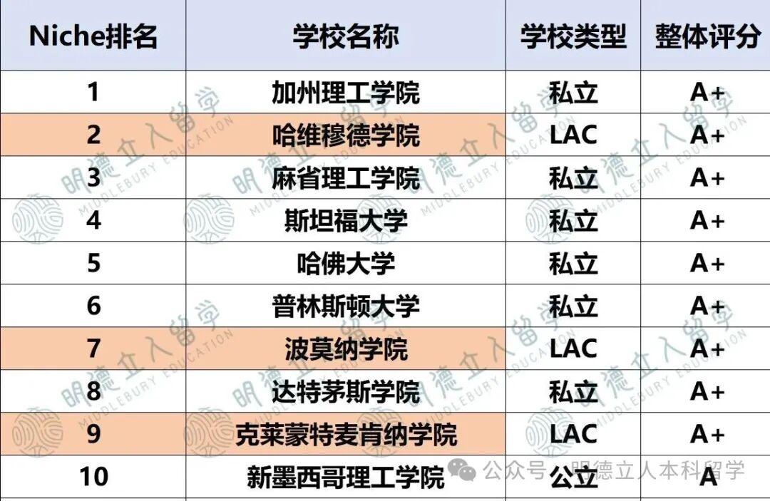 除了前十的3所,还有阿默斯特学院、斯沃斯莫尔学院、威廉姆斯学院、华盛顿与李大学、贝里亚学院、鲍登学院。