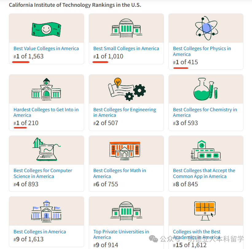 多个排名前十:最好的工程学院第2、最好的化学大学第3、最好的计算机科学学院第4、最好的数学学院第6、接受通用申请最佳大学第8