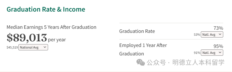 毕业生五年后收入中位数为每年89,013美元,学生毕业一年后就业率达95%。
