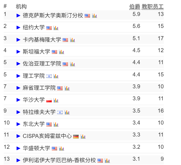 6-10名:加州大学圣地亚哥分校、伊利诺伊大学厄巴纳-香槟分校、佐治亚理工学院、韩国科学技术院、新加坡国立大学;