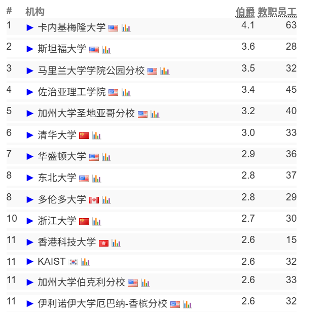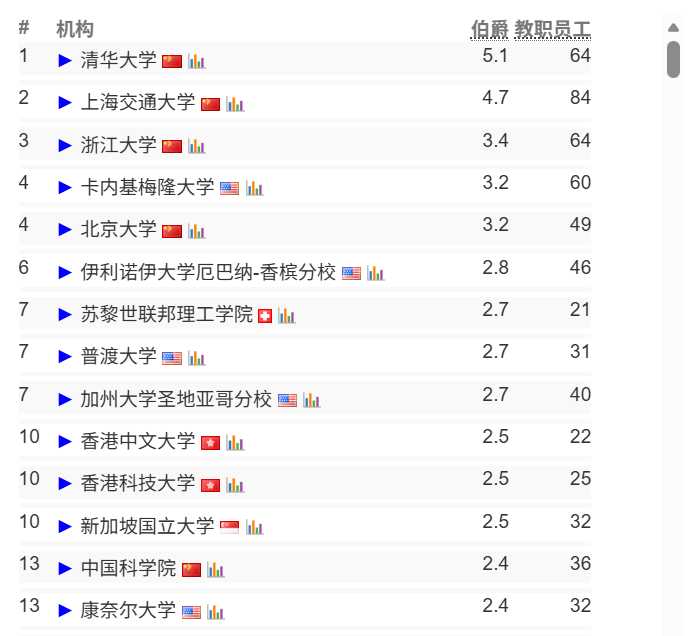 上海交通大学则是超越了卡耐基梅隆大学,来到总榜第二名的位置。